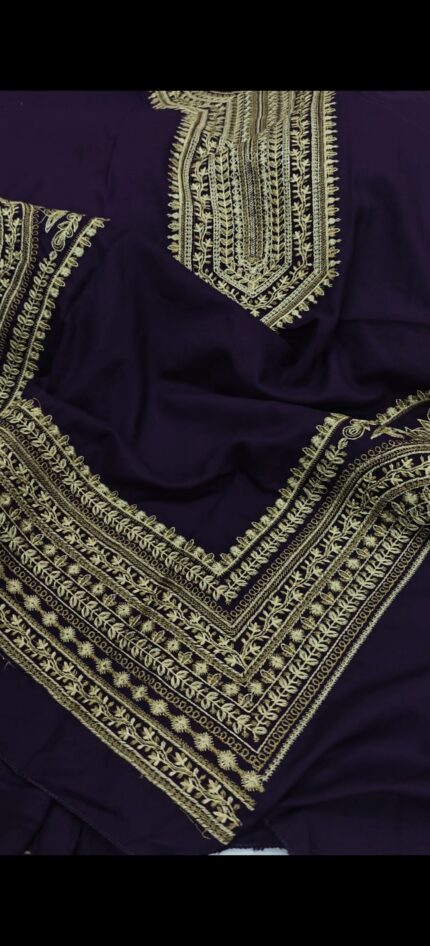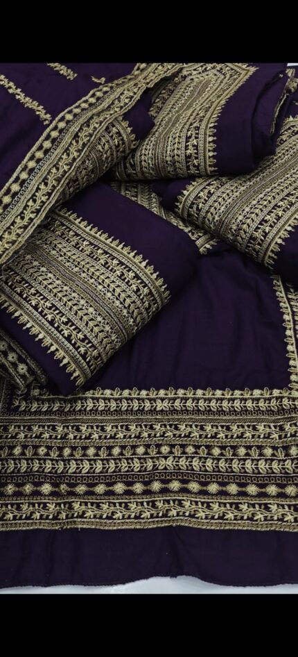 Made from high-quality peach wool, this lovely Bareeze winter suit has a lovely purple hue. The front and sleeves have intricate embroidery, while the back and trousers are plain and the shawl is totally embroidered. Only available for 3450